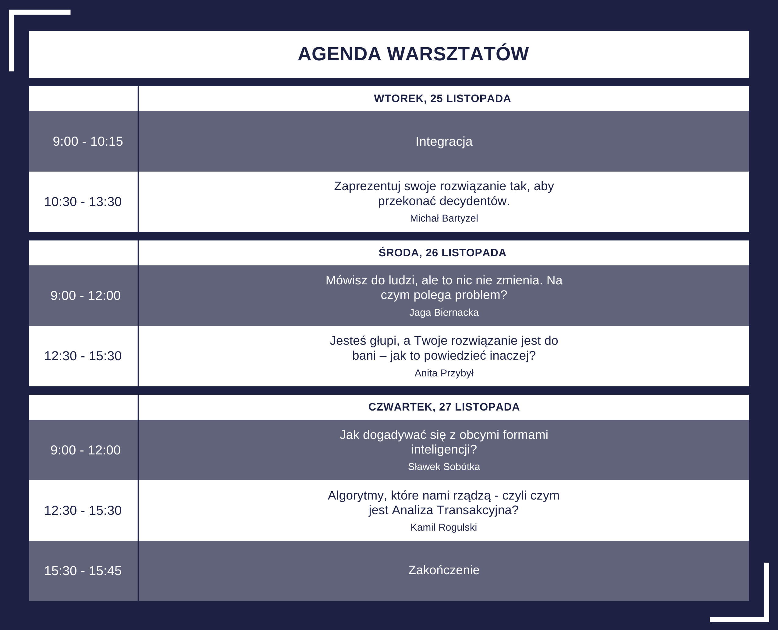 3. Nie pracujemy nad najważniejszymi z punktu widzenia biznesu zadaniami, bo nie potrafiliśmy do nich dotrzeć.Rozwój umiejętności miękkich nie jest niczym nadzwyczajnym. To umiejętności jak każde inne. Tego po prostu można się nauczyć, tak samo jak nowego języka programowania czy frameworka.Chcemy Wam dać konkretne, gotowe rozwiązania, narzędzia, wręcz algorytmy do zastosowania w relacji z biznesem, zespołem i samym sobą, podczas krótkich warsztatów, na których będziecie je intensywnie ćwiczyć.Oto nasza misja.